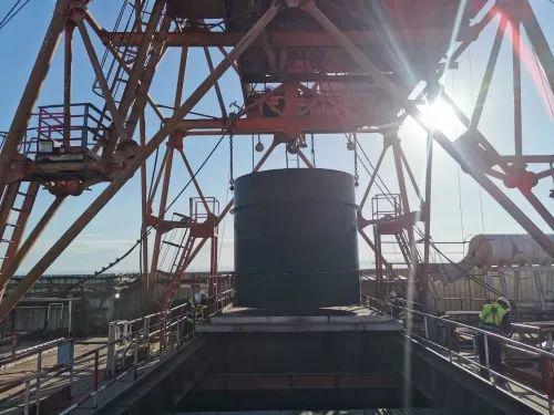 日前,隨著C68-67管節吊裝就位,電站500米級超深高壓豎井壓力鋼管安裝高度突破了海拔0米,從負海拔轉入正海拔施工。
